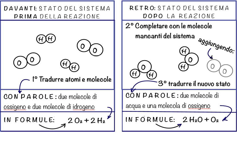Gli obiettivi a) e b) sono dunque finalizzati a prevenire il vuoto di significato che si verifica nel primo biennio della scuola secondaria di secondo grado quando gli studenti affrontano equazioni chimiche, bilanciamenti e calcoli stechiometrici. La pratica nella codifica c) serve a fornire uno strumento di sintesi che potrà soppiantare gradualmente le immagini iconiche degli oggetti contenuti nei sistemi chimici, ma potrà anche tradursi, con la pratica, in strumento di decodifica, dalla simbologia dell’equazione di reazione al modello mentale iconico del sistema chimico; processo che _4_corpo-testomente non si può verificare per l’assenza di un qualsiasi modello mentale esplicito e sufficientemente praticato.