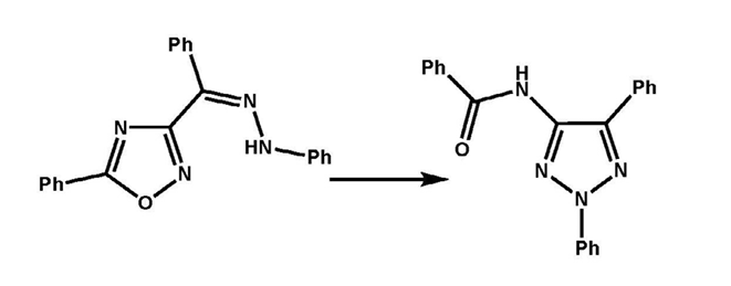 Figura 3. La reazione di Boulton-Katritzky sullo (Z)-fenilidrazone del 3-benzoil-5-fenil-1,2,4-ossadiazolo